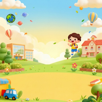 扁平化插画风格,以学习为主题,两个充满活力的学生坐在一本巨大的绿色翻开的书本上,男孩穿着蓝色背带裤和黄色衬衫,头戴蓝色发带,双手高举;女孩穿着粉色连衣裙和白色开衫,扎着双马尾,挥舞着右手,周围漂浮着红色铅笔、紫色三角尺、黄色星星、绿色笔记本和橙色毕业帽,整体色彩明快活泼,构图饱满,线条简洁流畅,充满青春学习的欢快氛围。