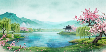 古典中式园林,水彩插画风,清新唯美,花木繁茂,流水潺潺,尽显雅致。