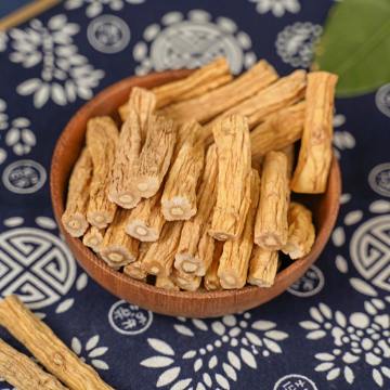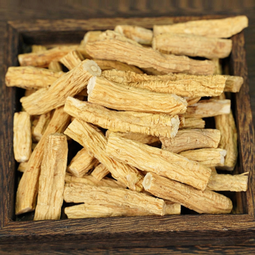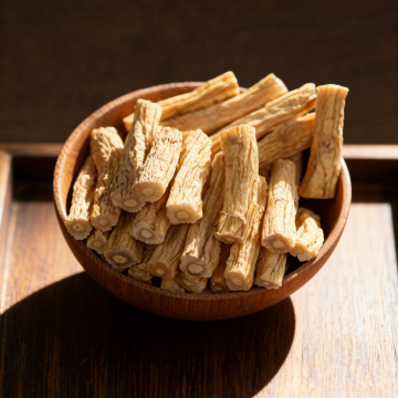 一张人参的产品图片,主体是一株完整的人参和几片人参切片,背景为纯白色。人参的根部呈现出自然的土黄色,表面有细密的纹理和须根,切片的断面为黄白色,带有明显的年轮状纹理。几片绿色的人参叶子点缀在切片旁边,增加了画面的生机感。整体光线明亮柔和,突出了人参的质感和细节,图片具有清晰的产品展示效果,适合用于中药材或保健品的宣传。