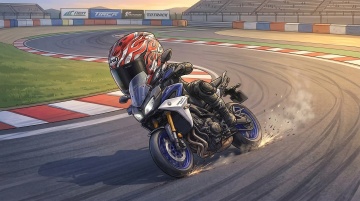 插画风动漫赛车场景,重拟物风格展现摩托车高速过弯的酷炫感与热血感,光影与粒子效果强化速度体积感,赛道氛围拉满。