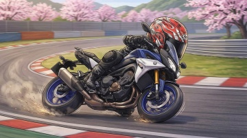 动漫风插画,重拟物摩托车疾驰赛道,樱花纷飞,动感十足,酷炫热血,粒子飞溅,春日竞速激情。