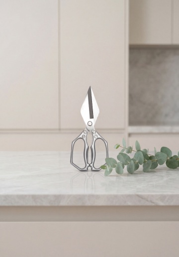 六把不同造型的剪刀系列素材集合,每把剪刀保持金属刀刃的光泽质感与黑色塑料手柄的材质对比,分别呈现完全不同的开启角度、手柄弧度和刀刃形状,以规整的网格排布于纯色背景上,整体采用统一的写实摄影风格,光线从左上方45度角照射形成自然阴影,色彩变换为清新的蓝绿色调,画面简洁无文字信息,突出剪刀的功能性设计美感与系列化视觉统一性。