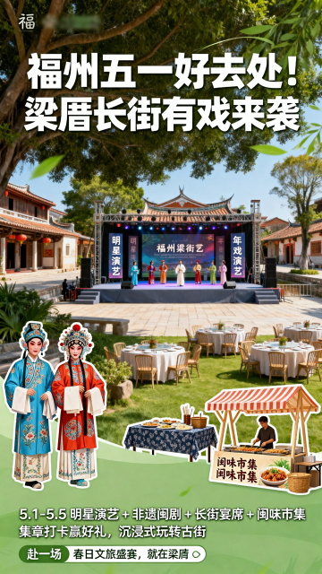 插画风海滩场景,扁平设计搭配大字标题,清新色系传递夏日清爽感,卡通人物点缀微缩艺术氛围,简约主义呈现五一出游季的舒适与活力。