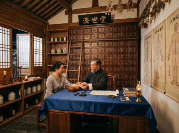 传统中药铺内部场景,温暖的黄色灯光从天花板吊灯洒下,照亮古朴的深棕色木质药柜,药柜由多个大小均匀的方形抽屉和格子组成,里面整齐摆放着各种中药材,包括根茎、果实、切片等,形态各异,颜色从浅黄、棕褐到深棕不等,柜台前的木质长桌上也排列着多个浅木色抽屉盒,同样装满各类药材,背景中隐约可见带有书法文字的卷轴挂画,整体氛围古朴、宁静、专业,充满传统中医药文化气息,光线柔和,阴影细腻,呈现出写实的摄影质感,细节丰富,色彩和谐统一。