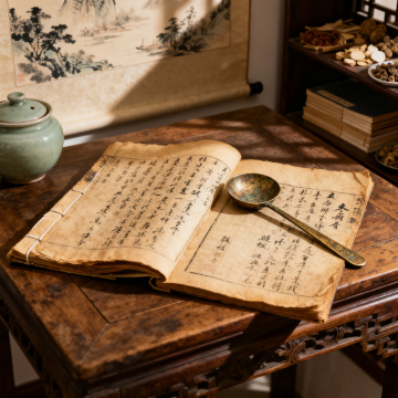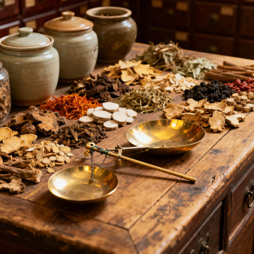 温暖柔和的自然光从古朴窗棂洒落,照亮中式木质药柜前的工作台,多种不同形态的中药材(如颗粒状、切片状、果实类)被分类盛放在木质托盘和浅碟中,一只手正用木勺将黑色种子类药材从托盘舀起,背景可见堆叠的线装古籍和盛放完整药材的陶瓷碗,桌面上铺着写有古朴文字的宣纸,整体呈现出写实的传统中医药氛围,色调以暖棕色、米色和深褐色为主,光线柔和细腻,细节丰富,具有浓厚的东方传统文化韵味和沉静专注的工作场景感。