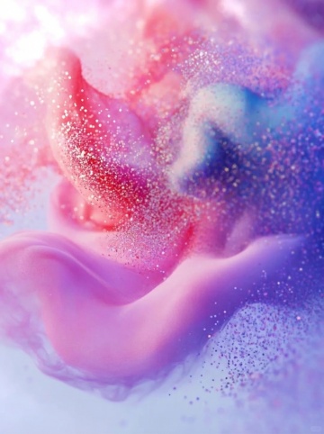 白色背景上,一团充满动感的抽象色彩飞溅图案,主要由明亮的黄色、橙色、粉色、蓝绿色和深紫色等鲜艳色彩构成,色彩间有自然的交融过渡,边缘呈现出不规则的、富有张力的笔触效果,整体形态如同颜料被快速挥洒而成,具有液态金属的光滑质感和强烈的光泽感,色彩饱和且富有层次,光影效果突出,给人一种活力四射、流动飘逸的视觉感受。