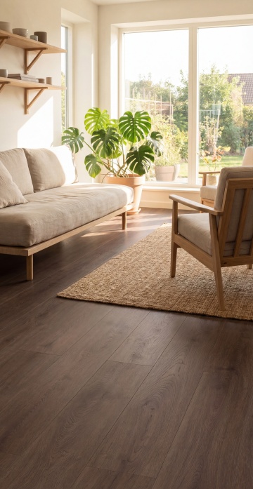 极简主义室内场景背景,高光木质地板,多种自然原木纹路,哑光漆面处理,清晰年轮纹理,温暖的浅棕色至深棕色渐变色调,柔和的顶部自然光照明,地板表面光滑反光,呈现出干净整洁的视觉效果,白色墙壁,简约白色窗帘,靠墙摆放的绿色植物,木质边柜,墙上挂着两幅简约装饰画,整体氛围明亮、通透、宁静,地板作为主体背景突出其丰富的木纹细节与装饰感。