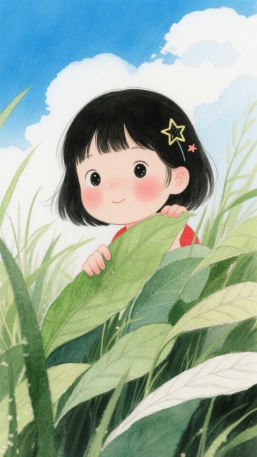 水彩风插画,女孩藏于绿叶间,星形发饰点缀,清新梦幻,手账风细腻笔触,柔和色调营造春日氛围。
