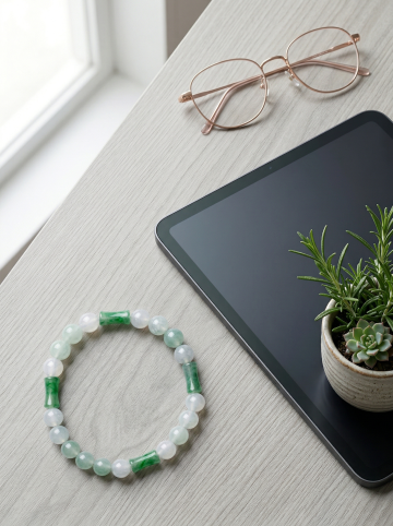 手链缠绕在前景小书上,中景摆放小笔和眼镜,背景虚化阅读角;强光影从顶部阳光投射,影子在书上交织,金黄反射