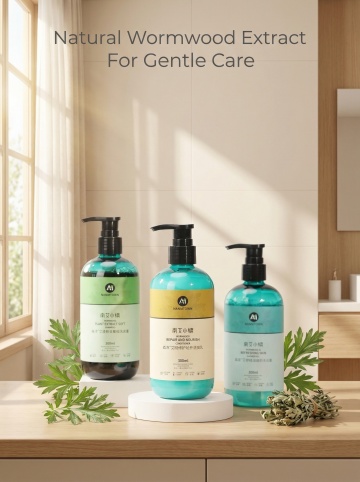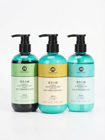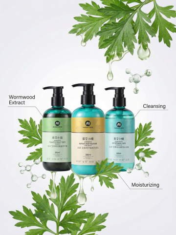 洗发水海报设计,两瓶深绿色透明液体洗发水瓶,搭配黑色按压泵头和白色标签,标签上有黑色文字与金色装饰细节,瓶身优雅放置于浅棕色木质树枝上。树枝下方是清澈湿润的水面,点缀着光滑石头,周围环绕着鲜活的绿色植物枝叶与根茎。整体采用清新自然的绿色调,柔和的侧光照明营造出宁静、有机、纯净的氛围,背景为渐变浅绿色。画面视觉层次清晰,以产品为绝对主体,光影效果细腻,水面呈现清晰的瓶身倒影,整体质感写实,设计简约自然,传达出天然植物萃取的产品特性。