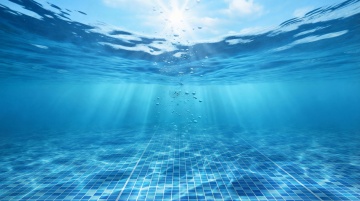 超写实水下场景,深邃的蓝绿色调,底部是纹理清晰的沙质海床,呈现出自然的波浪状起伏。光线从水面上方以分散的放射状光束穿透水体,较原图更柔和且分布更广,光束边缘带有轻微的光晕效果,照亮水中悬浮的微小颗粒,营造出梦幻而宁静的氛围,整体光影过渡自然,色彩和谐统一,画面具有强烈的空间纵深感。