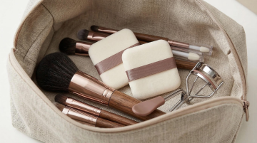 极简高端美妆产品集合海报,六个完全不同的美妆元素规整排布于纯白色纯色背景上,保持高清写实摄影风格,光线明亮柔和,物体表面有细腻高光与轻微阴影,展现透明玻璃与精致塑料的质感。元素包括:左上角为方形透明玻璃面霜瓶配银色金属盖,标签简约;右上角是圆柱形白色乳液瓶带按压泵头;中间左侧为长方体磨砂玻璃精华液瓶;中间右侧是黑色皮质化妆包带金色拉链;左下角为三支不同尺寸的化妆刷套装,刷毛柔软呈浅棕色;右下角为圆形透明唇釉管体。所有物体间距均匀,构图对称平衡,整体传达优雅、高端、专业的美妆产品氛围,无任何文字、LOGO、二维码及多余信息。
