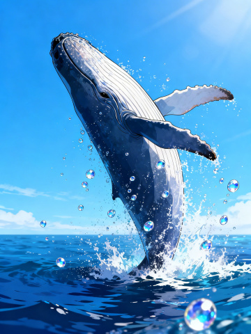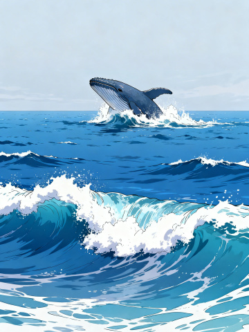 清透水色中,巨鲸与小船共游,插画风融合微缩艺术,水彩质感与噪点纹理交织,营造梦幻而宽阔的虚拟自然之境。