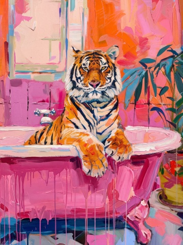 厚涂风油画质感,猫咪踏水前行,梦幻光影交织,清新唯美的自然诗意。