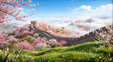 水墨风与工笔结合,长城蜿蜒于云雾缭绕的山间,梅花点缀,飞鸟掠过,营造出古典唯美的意境,展现中式山水的朦胧诗意。