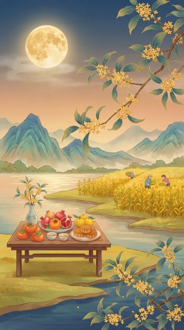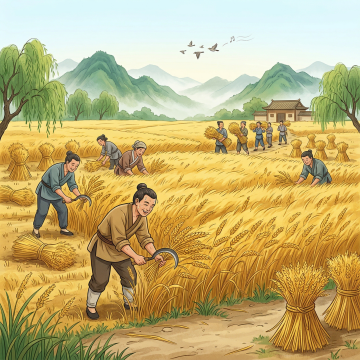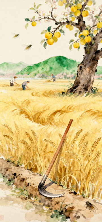 中国风插画风格,金色麦穗田野在夕阳下随风摇曳,饱满的麦穗颗粒分明,绿色麦秆挺拔有力,画面下方三分之二是一望无际的田野,上方三分之一是渐变的橙黄色天空与落日余晖,营造温暖喜悦的丰收氛围,留白占比35%,整体色调以金黄、橙红、翠绿为主,线条流畅,色彩明快,传递出对生活满足的幸福感。