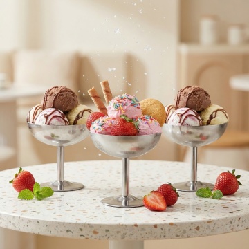 色彩鲜艳的写实风格冰淇淋球组合,透明雕花玻璃高脚杯盛放,三个不同口味的冰淇淋球堆叠:深棕色巧克力口味带细腻波纹,白色香草口味点缀黑色巧克力碎,浅棕色香草口味顶部装饰黑色几何图案巧克力片,右侧有螺旋状奶油,杯壁内侧底部有彩色水果丁(红色樱桃、黄色芒果块),两根棕色酥脆蛋筒斜插在冰淇淋球后方,整体光影明亮柔和,高光突出冰淇淋的丝滑质感和玻璃的透明光泽,色彩饱和度高且对比鲜明,构图饱满居中,背景为纯白色。