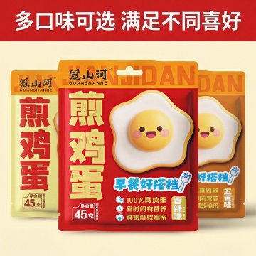 扁平风卡通包装,拟人蛋黄角色萌趣互动,双色设计突出低糖健康理念,印刷风文字强化促销信息,整体充满可爱感与节日喜庆氛围。