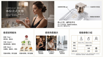 优雅奢华的香水瓶置于木雕风底座,搭配柔和插画风花卉,简约主义设计,尽显高贵。