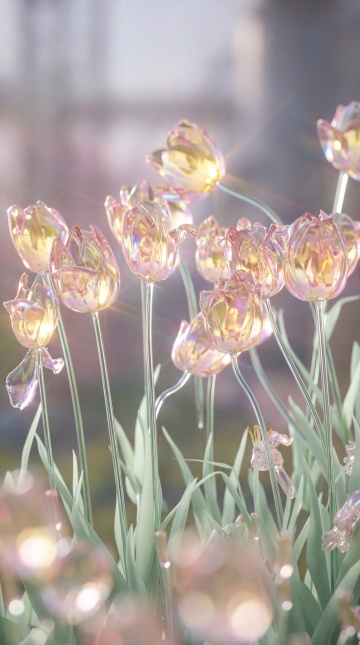 梦幻感玻璃花,3D渲染呈现清透唯美质感,融合虚拟自然与超现实主义,优雅绽放于柔光背景。