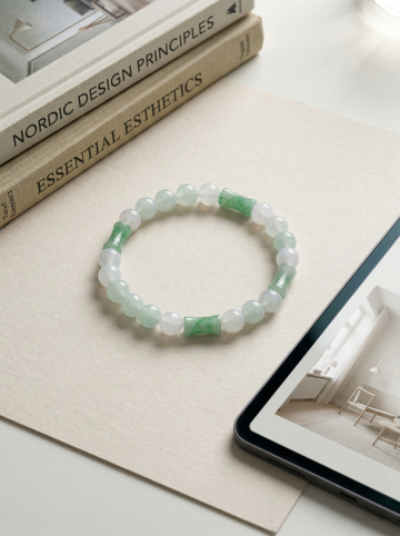 柔和光影中,粉晶手串静卧于木雕纹理之上,搭配干枝与石刻质感,营造出质朴文艺的中式静谧之美,传递舒适优雅的自然意境。