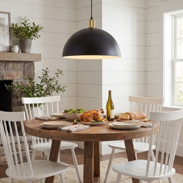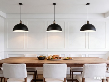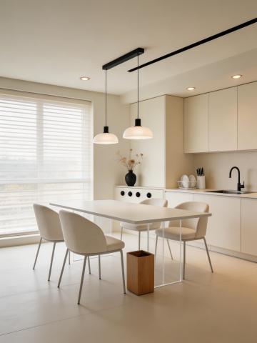 明亮通透的现代简约风格餐厅内部场景,以白色和浅木色为主色调,自然光透过大面积落地窗洒入室内,天花板悬挂着线条简洁的几何形白色吊灯,中央区域摆放着铺有浅色亚麻桌布的圆形餐桌,搭配浅灰色布艺餐椅,餐桌中央点缀着小型绿植花艺,靠墙设置悬浮式浅木色餐边柜,陈列着精致的玻璃器皿,角落处放置一个造型简约的藤编花瓶,插有几支白色和浅粉色的长茎鲜花,地面铺设浅色木地板,整体空间干净整洁、温馨舒适,充满自然清新的气息。