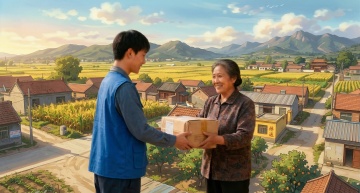 强烈镜头畸变,冲击力强,大幅度夸张动作,画面四周围绕的是很多红包和金币,身穿蓝色翻领T恤的快递员右手抱着快递箱,左手向前伸向镜头,刚刚接着一个大红包,惊喜的表情,表情开心,比例夸张,背景在室外的商场。主色调为红色和黄色。背后有红色的丝带。