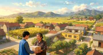 清新卡通风格,软3D设计,女孩指向前方,背景绿树青山,充满夏日旅行的欢快氛围。