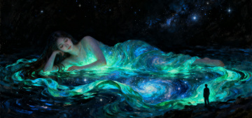 穆夏风梦幻女子,鎏金边框,花海与星月交织,超现实主义优雅。