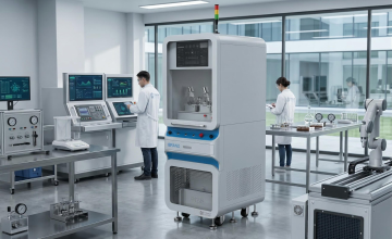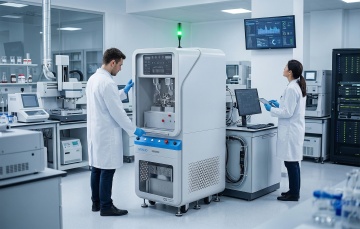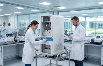 一个干净规整的现代化实验室场景,采用写实风格,以蓝白色调为主,光线明亮柔和,具有清晰的光影层次和细腻的质感表现。画面中可见身着白色防护服的研究人员在先进的白色和蓝色精密仪器设备旁工作,背景是带有规则几何图案的白色墙面。构图采用三分法,空间感强,整体氛围专业、严谨、科技感十足,适合作为背景使用。