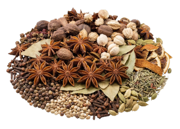 一张质朴的浅色木质砧板平放在深色木纹桌面上,砧板表面清晰可见自然的木纹肌理,边缘平滑。砧板周围散落着几颗完整的八角和黑胡椒粒,后方桌面上放置着一个装满浅棕色圆形颗粒食材的深色陶碗,碗的旁边有一块部分可见的深棕色亚麻布自然垂落。柔和的暖色调侧光从左上方照射,在砧板和桌面形成清晰柔和的阴影,营造出温馨、自然、略带复古的厨房氛围,整体画面质感细腻,光影层次丰富,细节清晰。