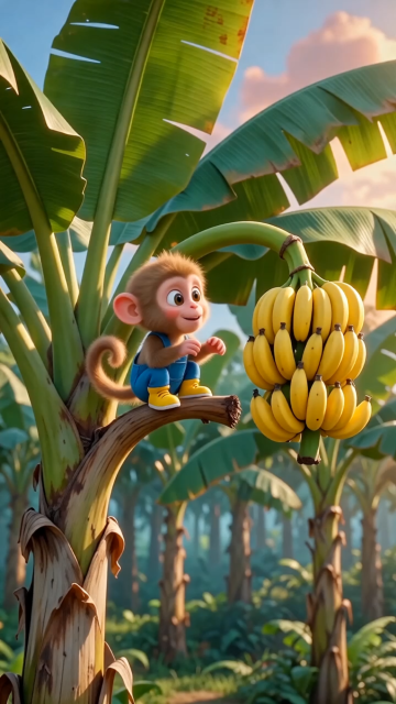 软3D风格的卡通猴子在香蕉林中跳跃,拟人化表情生动可爱,光影柔和梦幻,充满清新自然气息,展现童趣与活力。