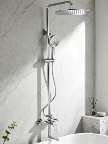 纯白色背景,六个造型完全不同的高写实3D立体水龙头,采用规整网格排布,保持统一的金属镀铬材质质感与明亮高光表现,光影采用顶侧光营造清晰阴影层次,其中三个水龙头呈现自然流动的透明水柱效果,三个为关闭状态的静态造型,每个水龙头在结构设计(如单把手、双旋钮、感应式、复古弯嘴、现代简约直线型、瀑布出水口等)上各具特色,整体画面干净简洁,突出水龙头的工业设计美感与功能细节对比。