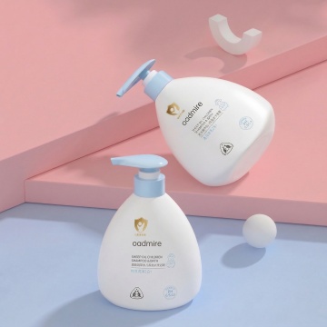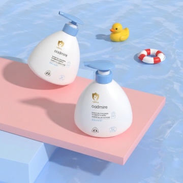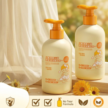 清新治愈的母婴洗护产品商业渲染风格,软萌活力的视觉氛围,采用中心聚焦式构图(浅景深虚化远景,突出产品主体);场景设定为澄澈浅蓝晴空背景,绿色区域生成蓬松绵密的白色泡沫。红色区域生成鲜橙切片,半浸没在蓬松绵密的白色泡沫中,主体为米黄色按压式儿童洗护瓶,半浸没在大量蓬松绵密的白色泡沫中,瓶身印卡通橙熊 IP 形象,橙色按压泵头朝上;材质表现:瓶身为哑光 PP 塑料质感,泵头为磨砂橙色塑料,泡沫为绵密蓬