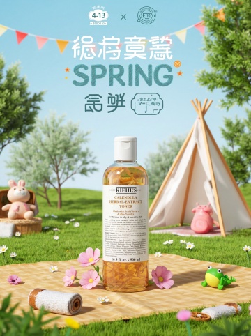 软3D风融合微缩艺术,樱花飘落的梦幻超市场景,搭配毛发生长般的绿植与卡通萌物,营造清新甜美氛围,传递春季焕新主题。