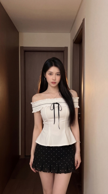 保留图3中人物的头部和黑色长直发型,将人物穿搭替换为米白色露肩蕾丝拼接缎面短裙,去掉包包,双手自然下垂,调整为模特般纤细腰肢和好身材比例,将背景替换为图4的室内浅米色墙面的简约室内场景,呈现半身画面
