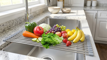 现代简约风格厨房场景,不锈钢材质的银色水龙头安装在白色石英石台面上的嵌入式水槽边缘,水龙头线条流畅、设计简洁,带有弯曲的出水嘴和旋钮式开关,表面光滑且有金属反光质感。台面干净整洁,左侧窗台上摆放着一盆盛开的白色百合花,右侧窗台上放置着几个新鲜的青柠和柠檬,窗外透进明亮的自然光,光线柔和地洒在台面和水龙头上,形成淡淡的阴影和高光,整体氛围清新、明亮、整洁、温馨,具有现代家居的舒适感和简约美学。