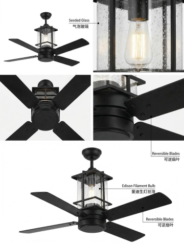 美式复古风吊扇灯,融合工业感与质朴感,采用气泡玻璃与爱迪生灯丝泡,金属框架搭配可逆扇叶,重拟物设计凸显现代感与复古细节。