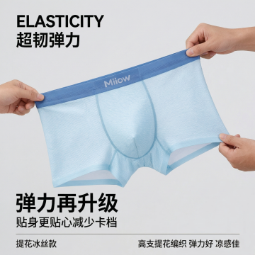 主体泡在波光粼粼、带有闪烁光点的淡蓝色水池里,以俯拍视角呈现,清新、水润的质感,采用写实的产品摄影风格。内裤需要平整顺滑,浸入在水中