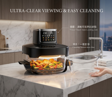 现代感与科技感交融的厨房场景,金属风电饭煲置于大理石台面,搭配清新果蔬与轻拟物设计,营造简约主义下的清爽舒适氛围。