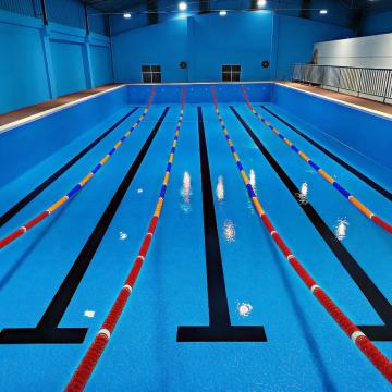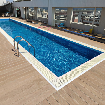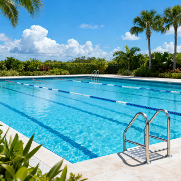 夏日泳池场景,高清晰度写实摄影风格,明亮阳光照射下的清澈蓝色池水,池壁由白色和深蓝色瓷砖铺砌,带有金属扶手的泳池阶梯部分浸入水中,水面波光粼粼并反射出耀眼的光斑,池边铺设浅棕色防滑地面,边缘点缀着色彩鲜艳的夏季花卉如粉色和黄色的绣球花,几只彩色充气游泳圈随意放置在池畔,远处可见白色遮阳伞和蓝白条纹的躺椅,营造出轻松愉快的夏日度假氛围,温暖的色调,清晰的光影对比,自然的阴影投射,整体画面充满夏日活力与清凉感。