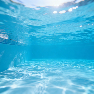 高清水下视角的泳池内部场景,池壁由整齐排列的浅蓝色瓷砖铺成,阳光透过水面在瓷砖上形成明亮的光斑和波纹倒影,水面波光粼粼,增添夏日清凉氛围,池底可见清晰的瓷砖纹理,整体色调以清澈的蓝白为主,光线柔和且富有通透感,营造出宁静、清爽、充满夏日气息的水下空间。