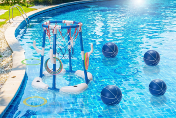 夏日阳光照射下的清澈泳池,池壁由蓝白相间的马赛克瓷砖铺成,池边设有银色金属扶手的泳池阶梯,水面波光粼粼,池畔放置着色彩鲜艳的充气游泳圈和漂浮饮料杯,旁边散落着几片绿色棕榈叶,远处有遮阳伞和白色躺椅,整体呈现明亮欢快的夏日氛围,高清晰度写实摄影风格,光线充足,阴影清晰。