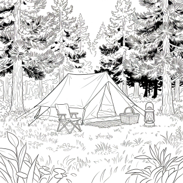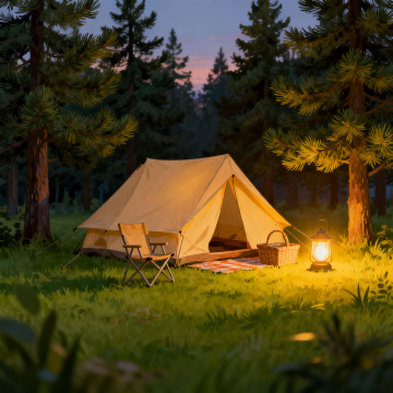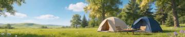 3D风重拟物设计,虚拟自然场景,清新舒适,柔和光影,质朴露营氛围,融合水彩与印象画派笔触,营造春日野趣。