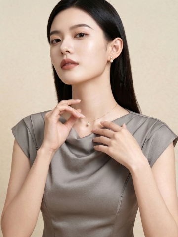 高清晰度商业人像摄影,柔和明亮的光线,细腻自然的肤色质感,棕色长卷发自然垂落,部分发丝轻盈飘动,身着浅米色简约吊带,佩戴金色细圈耳环和金色细手镯,半身构图,女性侧身站立,一手轻抚颈部,另一手自然下垂,眼神温柔望向镜头,背景为纯白色,整体呈现清新、优雅、纯净的氛围,画面简洁干净,突出人物主体。