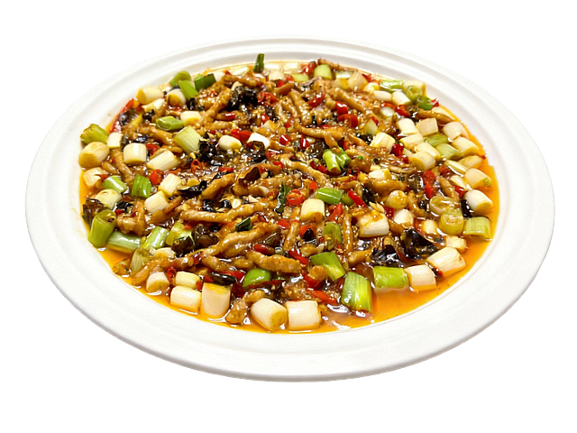去掉图片里白色雕花旁的绿色葱类装饰,其余摆盘、鸡肉、雕花、红椒等内容保持不变,保留原有的画质和色泽效果详情