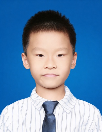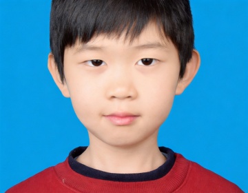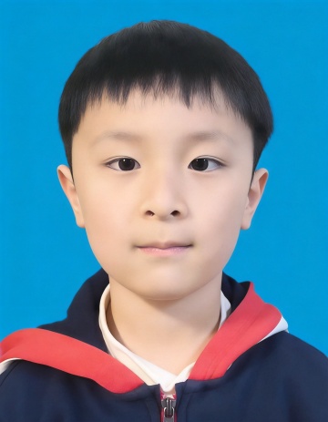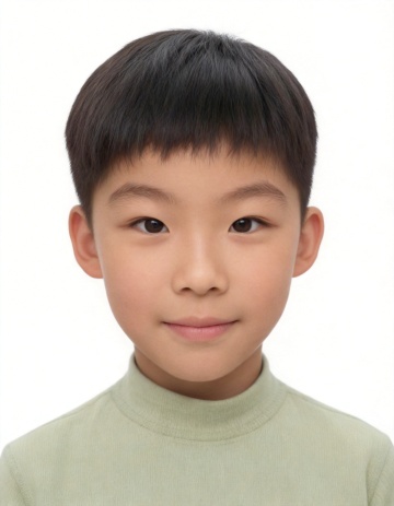 保留第一张图中人物发型、脸型、年龄特征生成标准样式纯正面儿童证件照;人物主体严格居中,头部大小与位置严格对齐第二张图,双肩水平平衡,面部中轴线对齐画面中心,正视前方;标准儿童证件照构图,人物绝对居中,头顶上方距离上边缘高度10%,下巴距离画面下边缘高度36%,人物主体占比约72%;肩部平展与画面水平轴平行;头部占比严格对齐第二张图;提亮肤色,消除暗沉,清透裸妆,隐形毛孔,均匀肤色,唇色自然提亮;肤色白皙细腻,原生轻透肤质;眼神澄澈,看向镜头,气质自信,嘴角微微上扬表情自然;耳廓可见度一致;肩部平展,肩线与画面水平轴平行;头肩比例协调呈现;免冠,不戴帽子,无头饰,无发带,不戴眼镜,无胡子,面部无痣,消除面部瑕疵;露出双耳、不遮挡眉毛、整洁、发色自然;身着灰色针织V领背心,带有藏蓝色和白色条纹V领镶边,内搭浅蓝色翻领衬衫;标准焦段50mm,纯正面,入境范围头部至胸部以上区域,F/4光圈(兼容F/2.8-F/4区间),平视视角(镜头与人物视线完全齐平),正视视图;人物绝对居中(居中构图),位于画面中心;严格限定标准证件照规格;视线水平(瞳孔连线与画面水平线平行);双耳对称露出,双肩水平且平衡,头部占比严格对齐垫图,禁止大头照(画面铺满画布,无边框留白);柔和正面顺光均匀柔光,面部明亮无硬影,背景均匀提亮,画质清晰,零噪点降噪;面部清晰;背景亮度均匀统一;高清锐利画质,细节清晰可见;零噪点处理;色彩还原自然;均匀柔和布光,无明显阴影,面部光影干净,柔光正面打光,自然光影过渡,皮肤质感细腻,哑光质感;极简纯色蓝色背景,背景亮度均匀且统一(哑光质感);专业证件照质感,高清人像质感,细腻皮肤纹理,严格按照第一张图内容生成,分辨率4K,画面比例7:9