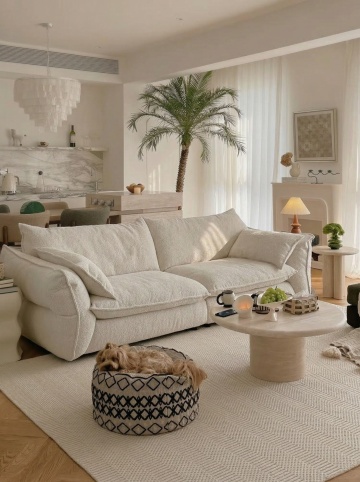 柔和米白调客厅,融合几何线条与充气风沙发,展现简约主义的舒适质感,面料纹理与实景光影交织,营造温馨质朴的现代家居氛围。