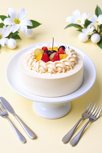 清新柔和的奶油蛋糕,点缀鲜果与白花,轻拟物风设计,实景感十足,营造甜蜜舒适的春日氛围。