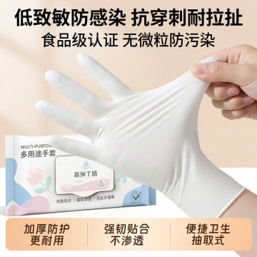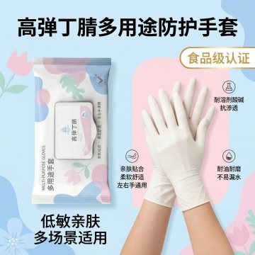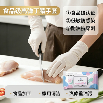 基于提供的丁腈手套产品图生成1:1主图,多场景展示,浅暖调背景,分四个圆角小图展示不同使用场景:食品加工、汽修重油污、化工实验室、家用清洁,顶部大字“多场景适用 一盒全搞定”,保持原清新风格,主体突出,1:1比例